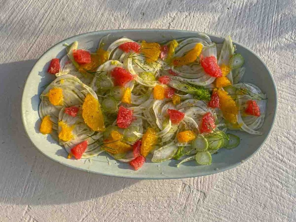 11h28, j’arrive au marché. Aujourd’hui la température est douce, il ne fait pas loin d’une vingtaine de degrés, pour changer de la soupe je vais réaliser une de mes salades fétiches : la salade de fenouil aux agrumes. Ça tombe bien, mon producteur a des montagnes de fenouil ! Hop, une orange et un pamplemousse et un peu d’huile de sureau que j’ai rapporté de la boutique Bras, à Laguiole mais on en trouve dans toutes les épiceries fines ! Bon appétit.
